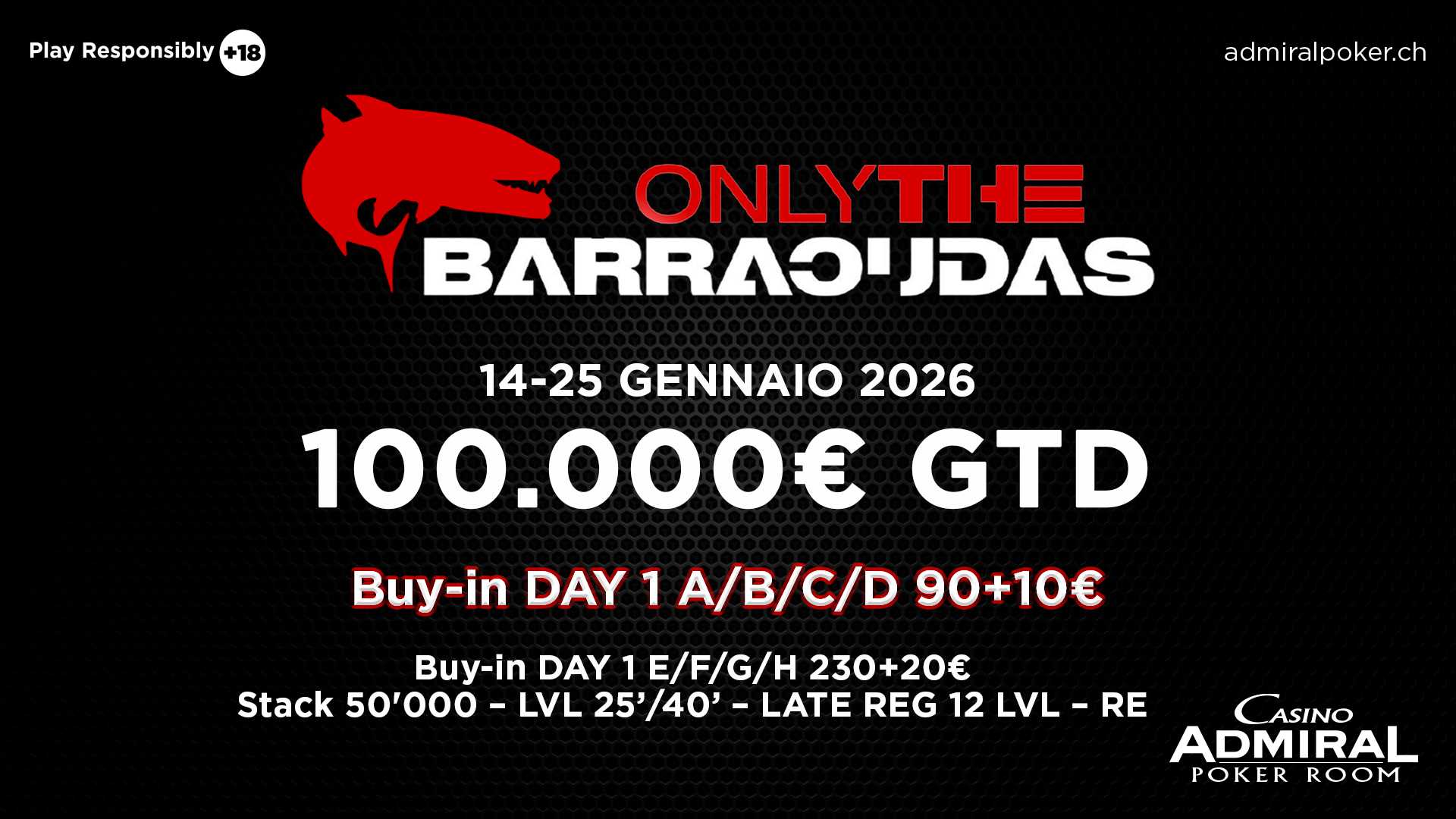 Il est important de noter que le barracuda est un poisson prédateur, dangereux même pour les humains, notamment les plongeurs, car il attaque tout ce qui bouge. C'est la célèbre phrase associée à ce tournoi historique qui, après dix ans, revient sur son lieu de naissance, le lac où tout a commencé. Only The Barracudas débarque au Casino Admiral de Mendrisio avec un nouveau look, mais avec le même objectif : un tournoi accessible à tous, amateurs, habitués ou professionnels.